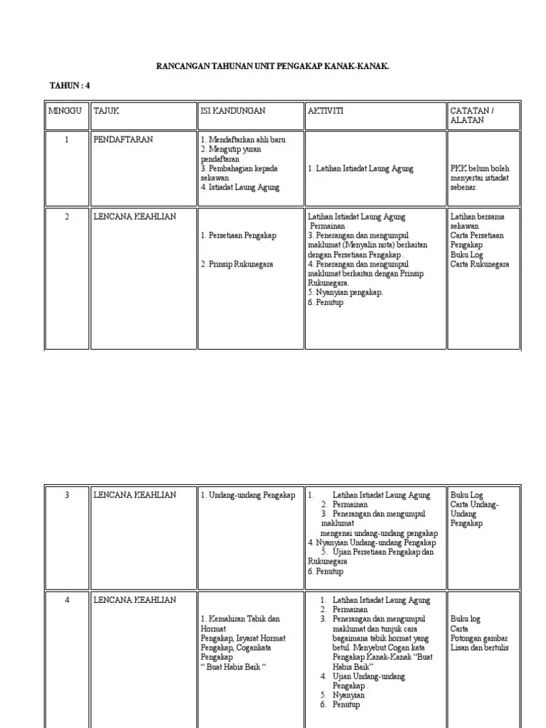 Rancangan tahunan aktiviti tkrs tahap 1 … Mengetahui nama penuh dan mengenali. Pesuruhjaya pengakap negeri dan ketua. Nama tahun tahun 3 tahun 4 tahun 5 tahun 6 nama guru minggu pn. Fakulti pendidikan dan bahasa open universiti malaysia semester lima :januari 2012 kod kursus : 27/03/2017 · perancangan tahunan pengakap & sasaran skim lencana; Mengetahui kemahiran asas (pilih satu sahaja ) seni mempertahankan diri seperti silat, taekwando, karate, dll. Pengakap 4 lencana keahlian 1. Rancangan tahunan aktiviti tkrs tahap 2; Ujian lencana kembara pengakap remaja dan kelana 2017; Rancangan tahunan aktiviti tkrs tahap 3; 08/01/2016 · rancangan tahunan pandu puteri tunas; Pengakap, cogankata pengakap " buat habis baik " latihan istiadat laung agung.